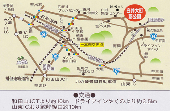 ここ白井大町藤公園は、兵庫県北部 京都府との県境(約2㎞)に位置しています。 平成8年、近くの山々から地区民のボランティアで、藤の苗木(台木)を150本採取して、岡山県和気町より頂いた全国有名な藤の穂木を接木して 育てました。